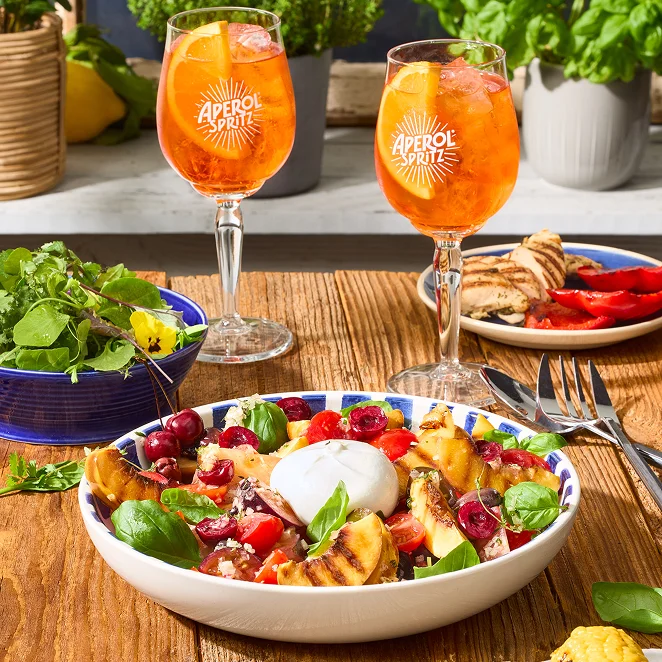 Für den Salat Nektarine halbieren, entsteinen und in Spalten schneiden. Das Obst auf dem Grill pro Seite ca. 2 Minuten grillen. Kirschen und Tomaten waschen und abtropfen lassen. Kirschen halbieren, entkernen und in Spalten schneiden. Tomaten halbieren. Oliven und Burrata abtropfen lassen. Basilikum waschen, trocken schütteln und die Blätter abzupfen. Nektarinenspalten, Kirschen, Oliven und Tomaten auf Tellern verteilen. Burrata auf den Salat legen und Basilikumblätter darüberstreuen.
